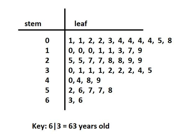 - Create a stem-and-leaf plot (split into stems and leaves, e.g., stem 6 | leaves 5, 8 for 65, 68).